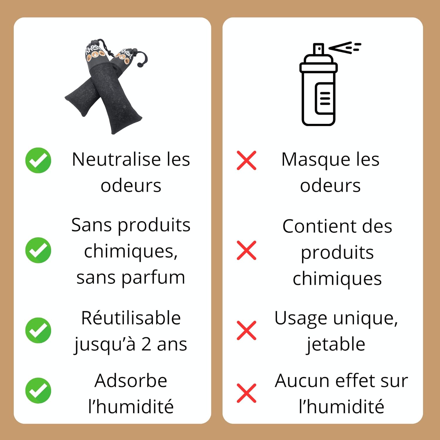 • ABSORBEUR D’ODEURS NATUREL – 2 pochons de charbon de bambou conçus pour capter naturellement les mauvaises odeurs dans les espaces fermés – Idéal pour placards, chaussures, voiture, salle de bain ou pièce humide – Solution simple sans parfum artificiel