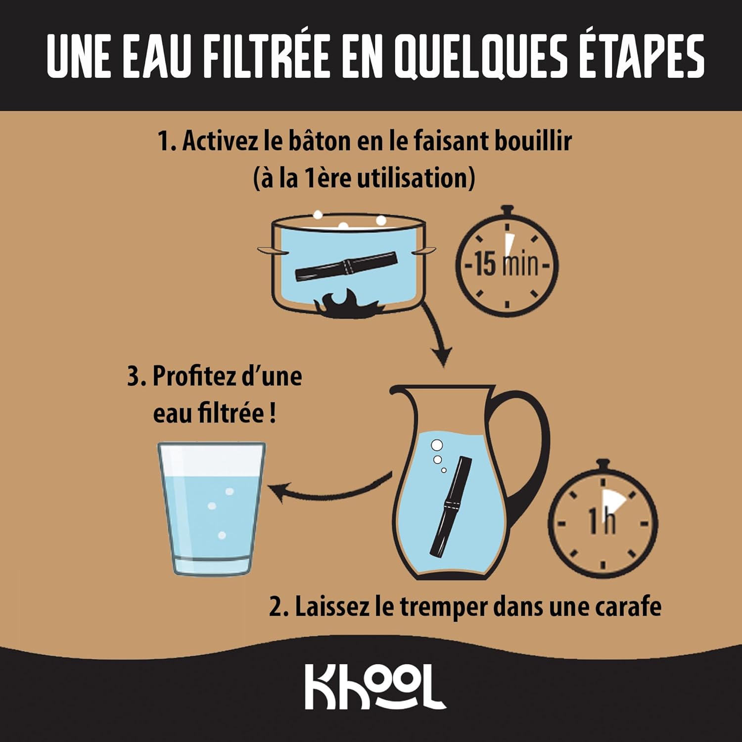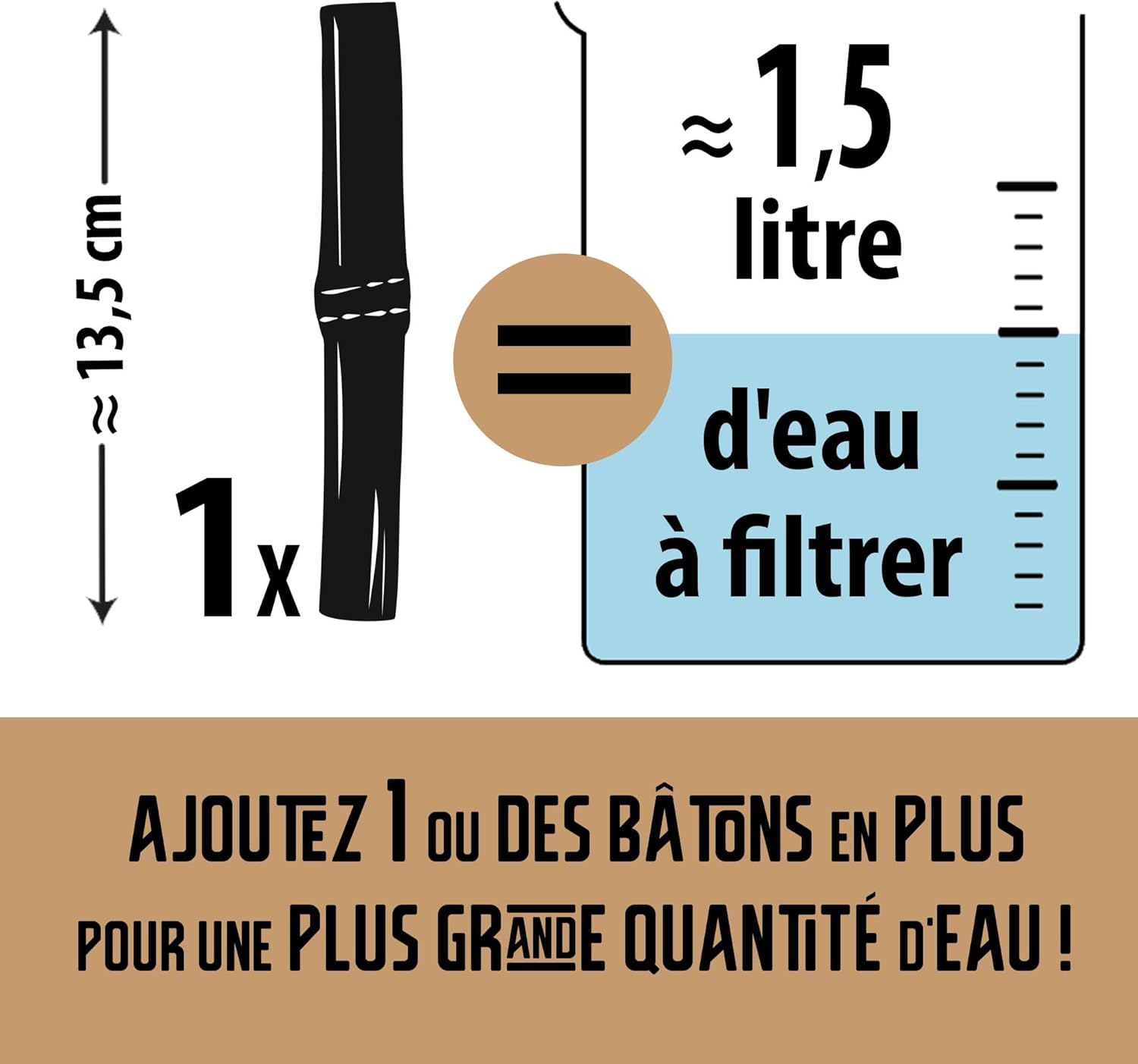 • CHARBON ACTIF EAU PETIT FORMAT 50CL – 5 bâtons de charbon actif de bambou conçus pour filtrer environ 50cl d’eau chacun – Idéal pour améliorer naturellement le goût de l’eau en gourde ou bouteille fine – Solution simple et écologique pour une filtration quotidienne par immersion